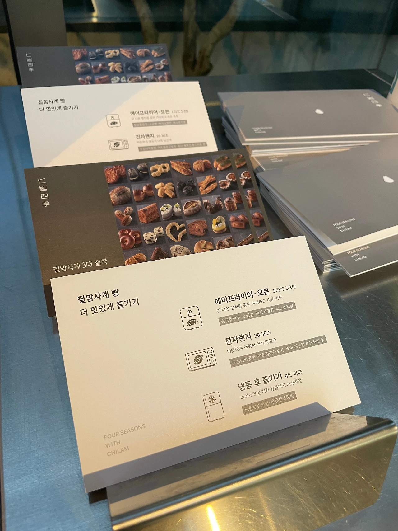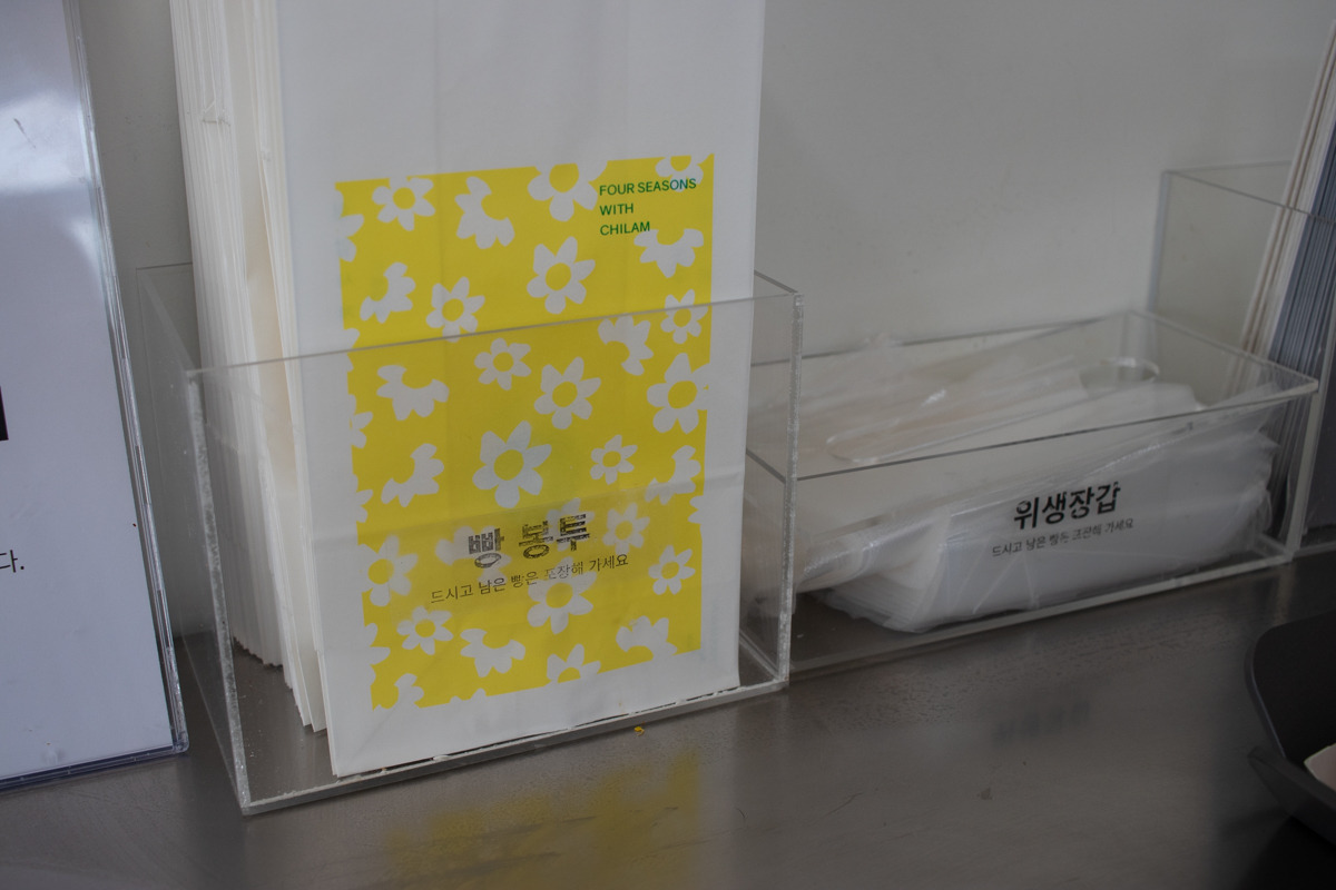 매장 곳곳에는 브랜드에 대한 친절한 안내를 담은 리플릿과 먹고 남은 빵을 가져갈 수 있는 봉투와 장갑, 그리고 보관방법까지 상세하게 안내하고 있어 마지막 남은 빵까지 맛있게 먹길 바라는 브랜드의 진심이 가득 느껴졌다. 근래에 만나는 많은 대표님들이 이런 종이 인쇄물에 대한 인식이 다소 부정적인 경우가 많이 있다. 직원, 인스타그램, 홈페이지 등이 있는데 굳이 버려질 인쇄물을 만들 필요가 있나요?라고 물어보시지만 나는 여유가 조금 있으시다면(사실 여유가 없더라도 이 정도 낱장 인쇄물은 정말 저렴한 가격에 만들 수 있다) 꼭 만들기를 제안드린다. 왜냐하면 아무리 친절한 직원이라도 하루에 수백 명씩 밀려드는 손님들에게 브랜드의 이야기를 다 전할 수 없고 반드시 알아야 하는 여러 가지 이용방법에 대해서도 모두 전할 수 없기 때문이다. 이런 종이 인쇄물들은 어쩌면 직원들을 대신해서 브랜드의 가장 친절한 안내자가 되어 소비자를 더욱 가깝게 응대하는 존재가 될지도 모른다. 칠암사계는 그런 면에서 친절한 느낌이라 직원들과 직접적인 대면을 하지 않았지만 친절한 응대의 느낌을 받았다. 그리고 이런 경험들이 하나둘 씩 모여 나뿐만 아니라 방문하는 많은 사람들에게 칠암사계는 다정하고 친절한 빵집으로 기억될 것이다.