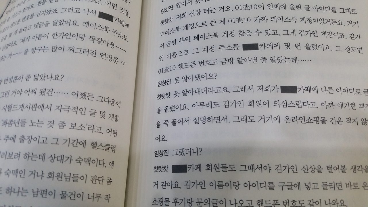 "찻탓갓: 음......기억이 나는 게...... 이런 식이죠. 류현진 선수 별명이 류뚱인 거 아시죠? 누가 글을 올려요. '류뚱 오늘 11승.' 그러면 축하한다, 잘 봤다, 그런 댓글이 달릴 테죠? 거기에 슬그머니 끼어드는 겁니다. '아무리 다른 데서는 류뚱 류뚱 한다지만 은게에서조차 선수 별명을 그렇게 부르는 건 아니지 않나요? 엄연히 외모 비하인데.' 그리고 다른 아이디로, '솔직히 저도 그 별명 들을 때마다 좀 불편했습니다. 옥주현더러 옥떨메라고 하는 것만큼요'라고 남기고. 이렇게 되면 함정이 만들어진거죠. '뭘 그렇게까지 과민하게 받아들이시나요'라는 사람에게는 이렇게 답을 달아주죠. '제가 이곳의 정치적 감수성을 너무 높게 평가했었나봅니다. 뭘 그렇게까지 과민하게 받아들이느냐는 타박이 세상 모든 폭력과 편견을 유지하는 큰 축이죠. 언제나.'(79쪽)
