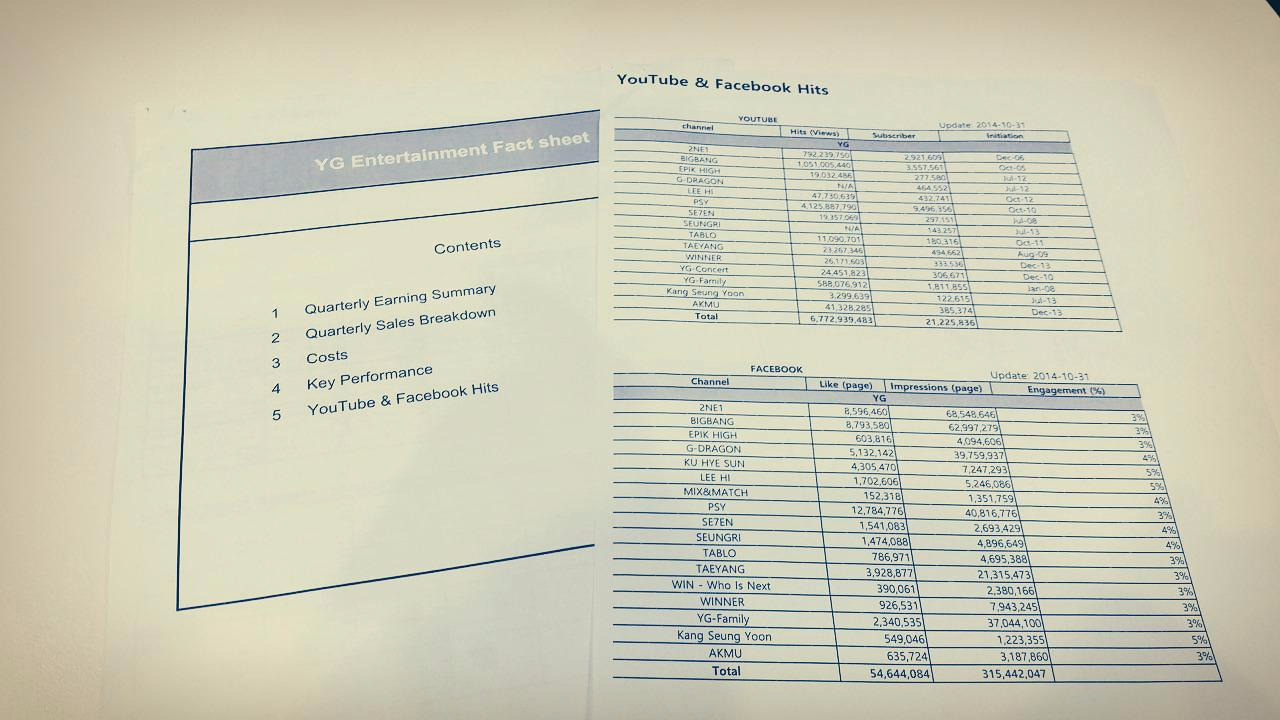 YG는 IR자료 끝에 자사가 보유하고 있는 유튜브 채널과 페이스북 페이지의 시청 횟수, 구독자수 등을 적시하고 있다. 이 자료는 1) YG 소속 가수들이 글로벌 시장에서 강한 경쟁력을 가지고 있다는 걸 보여주지만 동시에 2) 음원이 아닌, 영상 시장이 YG의 새로운 먹거리여야 한다는 현실을 암시하는 것이기도 하다.