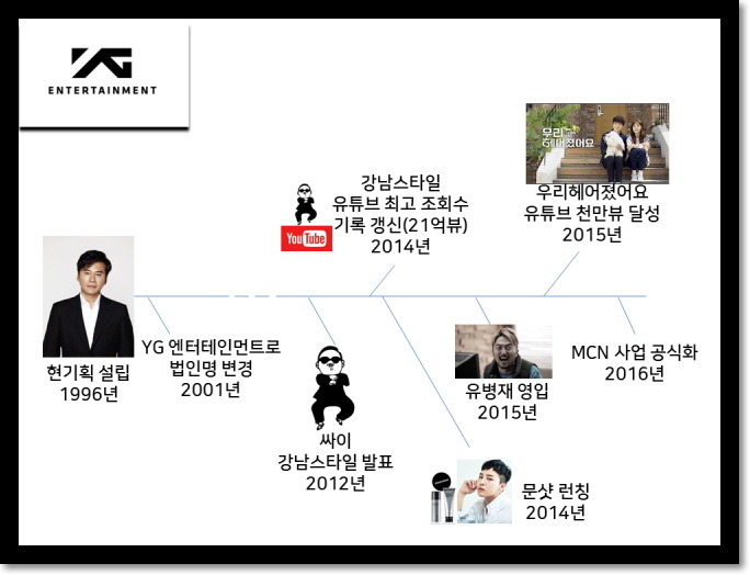 자사의 사업품목, 소속 연예인, 모델을 가장 효과적으로 시장에 소개할 수 있는 마케팅 방식에 대한 고민은 ‘강남스타일’과 ‘우리 헤어졌어요’로 증명된 저비용-고효율 영상 콘텐츠 제작에서 힌트를 얻어 MCN 사업 진출이라는 결론으로 이어졌다. 특히 콘텐츠 제작 역량을 인하우스화 하는 YG의 사업 방식이 MCN 사업을 호출했을 가능성이 크다. 일단 인하우스화 한다는 것은 외주화에 비해 리스크가 크다. 영상 사업에 진출하되, 인하우스화의 위험 부담을 줄이려면 방법은 간단하다. 제작 비용이 적은 영상 문법에 기대는 것이다. 그게 현재로써는 MCN인 것이다.
