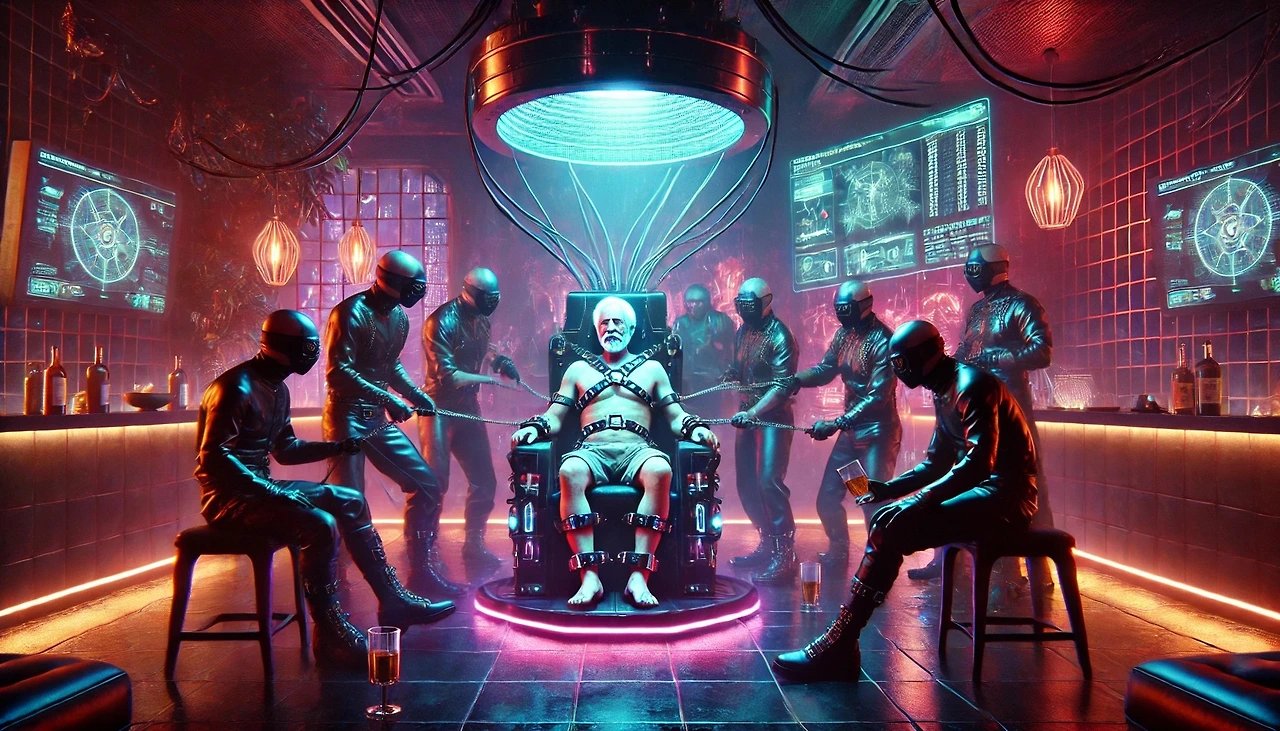 카디날 밸리 밀실. 이곳은 "VIP 프라이빗 룸"이라 불렸다. 네온 빛이 떨리는 공간, 벽에는 비명 소리를 차단하는 방음 장치가 설치되어 있었다. 몽 회장의 영혼이 묶인 채 깨어났다. 주위엔 왕릉에서 차원계 영생을 산 부자들이 둘러섰다—가죽 마스크를 쓴 늙은 남녀들, 손에는 채찍과 맥주 캔을 든 채였다.