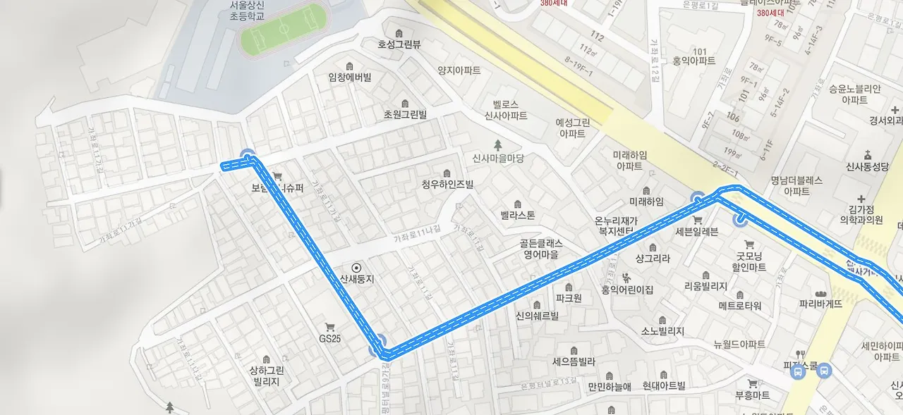 서울 은평구 산새마을을 지나는 마을버스 노선도. 2016년 재생 사업 결과 'ㄴ'자 형태 구간이 개통됐다.연결이라고 해서 꼭 버스, 택시, 지하철 이런 대중교통 수단을 떠올려야 하는 건 아니다. 지상 철로를 사이에 두고 쪼개지는 동네를 잇는 단순한 작업도 도시를 변화시키는 중요한 연결이 된다.