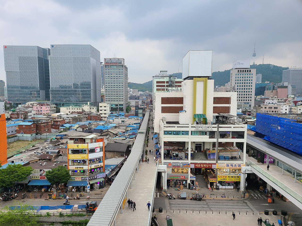 2021년 4월 세운상가 옥상에서 촬영한 청계상가 전경. 왼쪽으로 보이는 고층 건물이 을지트윈타워.