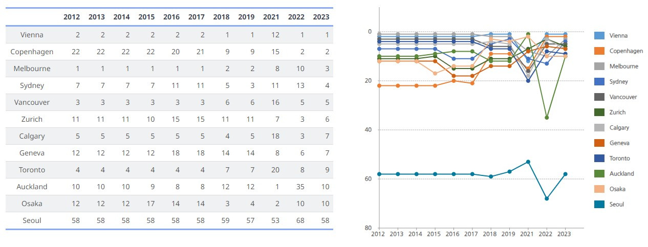 Liveability와 GCI의 최상위권에 든 도시는 서로 사뭇 다르다. 2023년 Liveability 1~5위는 비엔나, 코펜하겐, 멜버른, 시드니, 밴쿠버다. 이 차트에서 서울의 성적은 2012년부터 올해까지 줄곧 50위 밖이다. 2022년에는 68위까지 떨어졌다. 10년 넘게 그다지 발전―정주하기 더 좋은 환경을 조성―하지 못했다는 얘기다. 당연한 얘기지만, 외국인이 많이 찾는 관광지와 내국인이 선호하는 주거지는 다를 수밖에 없다. 그런데, GCI만 말한다는 건 행정당국의 관심이 다소 치우쳐 있는 건 아닌지 의구심이 들게 한다. 상식적으로 17위보다는 68위를 어떻게든 끌어올리는 게 더 시급한 과제 아닐까?