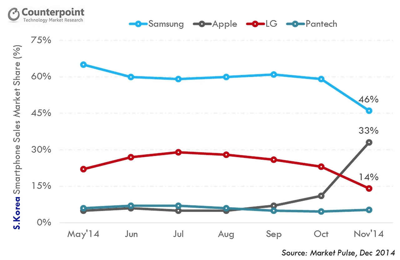 아이폰6와 6플러스 출시 이후 갤럭시가 46%까지 떨어지고 아이폰은 33%까지 올랐다. LG는 쭉 하락세이고 팬택은 유구무언이고...