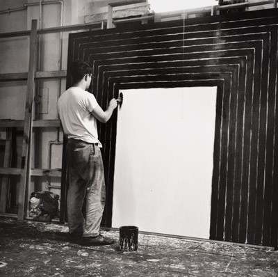 두 번째는 안쪽으로 향해가는 줄무늬의 특징이다. 흑색 회화는 오로지 반복되는 줄무늬만으로 이루어졌다. 그는 회화 표면을 평면으로 유지하기 위해서 밑칠을 하지 않은 캔버스에 연필로 줄무늬를 표시하고, 그 사이로 2.5인치의 집 페인트 붓을 이용해 거의 규격화된 줄무늬를 만들어냈는데, 그 줄무늬는 중앙에서 바깥쪽으로 향해가는 것이 아니라 가장자리부터 안쪽으로 향해 들어오는 특징을 지닌다. 이러한 방식은 줄무늬의 ’그려진 형태‘와 ’지지체의 실제의 형태‘를 일치시킴으로써 하나의 사물로서의 작품의 성격을 보다 돋보이게 하는 요소로 볼 수 있다.