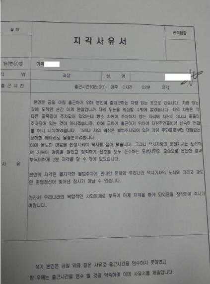 예전에 어느 유머 게시판에서 봤던 '직장인의 흔한 지각 사유서'가 생각났다. 나도 '본인의 지각은 중요한 행사이기에 정말 일찍 도착하고자 택시를 선택했던 판단 오류와, 출근시간에 과도하게 꽉 막힌 서울 교통시스템의 비효율성과, 그런 교통상황을 예측하지 못한 내비게이션의 데이터 오류로 인해 빚어진 참사가 아닐 수 없습니다'라고 말하고 싶다.