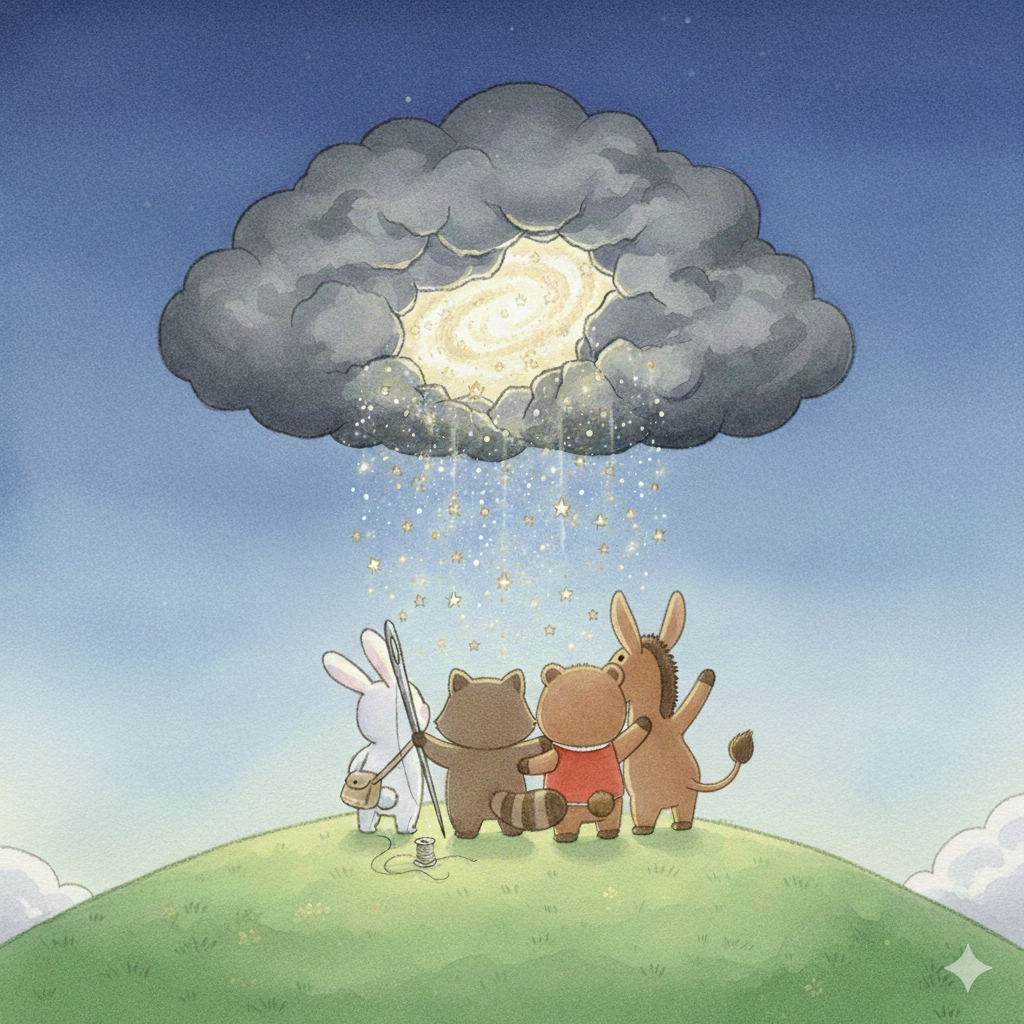 그러던 어느 밤, 사나운 먹구름이 몰려오더니 쩌억- 하고 구름에 커다란 구멍이 나버렸어요!