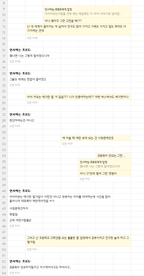 "내 주변에 결혼한 사람들 보면 결혼하고 애기 낳고부터 대화가 안통하고 이상해지더라. 사람이 애밖에 생각안하게 돼."