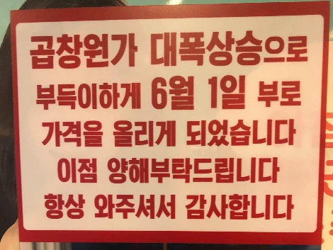 자주 오던 식당에서 갑자기 고깃값을 올려 받는다면 소비자 입장에선 미리 공지해 주길 바랄 것이다. 예상 결제금액을 생각하고 식당에 들어왔을 텐데, 계산서를 받아보고 터무니없는 가격에 당황하면 안 되지 않겠는가. 어떻게 해야 할지 고민 끝에 장문의 글을 수기로 작성해 여러 장을 대자보처럼 붙여보기도 하고, 곱창 원가 상승에 따른 가격 인상을 설명하여 프린트하여 곳곳에 붙였다.
