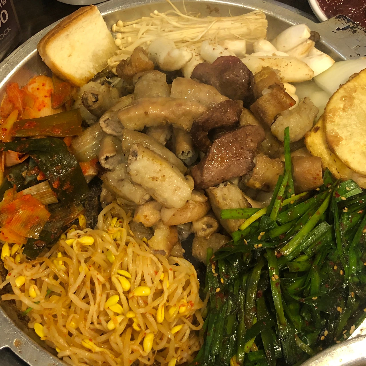 매년 겨울이 되면 따듯한 곳에서 자라야 잘 자라는 부추가 매우 귀해진다. 하우스에서 농사짓는 부추들만 유통이 되는데, 따라서 그 값이 매우 올라간다. 한날은 부추 한단에 5천 원을 훌쩍 넘어가던 겨울이었다. 한 테이블당 평균 부추무침을 2~3 접시는 드시는데, 부추가 비싸 돈을 더 내라고 할 수도 없고 안 드릴 수도 없는 노릇이었다. 그저 어쩔 수 없다는 듯 발만 동동 굴렀는데, 당시같이 일하시던 이모님께서 한 가지 아이디어를 제안하셨다. 바로, 볶음밥에 넣는 용도로 무쳐두었던 콩나물을 부추와 함께 담아 테이블에 올려보자는 것이었다. 이유인즉, 삼겹살을 구워 먹을 때도 콩나물을 함께 구워 먹으면 식감이 더 좋지 않냐는 것이었는데, 이는 맞는 말이었다. 무시무시하게 비싼 부추 값 때문에 이도 저도 못하던 차에, 그 말을 듣고 바로 실행하였다.