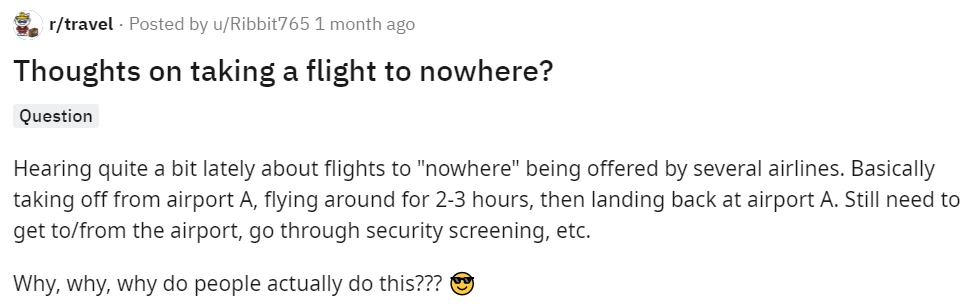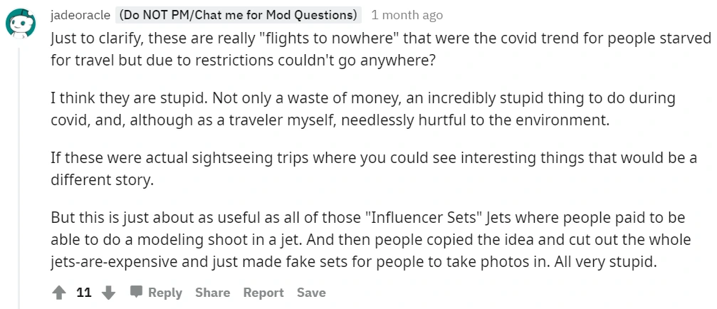 미국의 유명 소셜 뉴스 웹사이트 레딧에 뜬 포스트 "무착륙 비행에 대한 생각 - 도대체 왜왜왜 하는 거죠?"글을 마무리하며, 해외에서 무착륙 비행을 보는 시각이 어떤지 살짝 공유해 봅니다. 개인적으로 글을 쓰기 위해 조사를 하면서 50개가 넘는 국내 기사들을 읽었는데, 한겨레 기사 (링크: 무착륙 관광비행 탄소배출 논란… 목적지는 기후위기?)를 제외하고는 복사해서 붙여놓은 듯, 무착륙 비행에서 오는 이점만을 언급하고 있어 많이 안타까웠습니다. 아래 레딧 사용자는, "돈 낭비일 뿐만 아니라, 코로나 시국에 믿을 수 없을 만큼 바보짓을 하는 것이고, 불필요하게 환경에 해롭다."라고 말합니다.