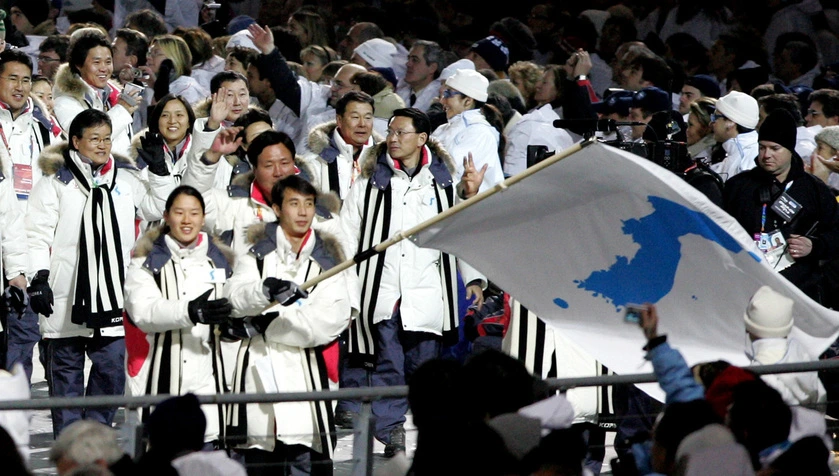 2006년 제20회 이탈리아 토리노 겨울올림픽 개막식에서 남쪽 이보라(왼쪽)와 북쪽 한정인이 한반도기를 들고 남북한 선수단과 함께 입장하고 있다. (출처: 연합뉴스)