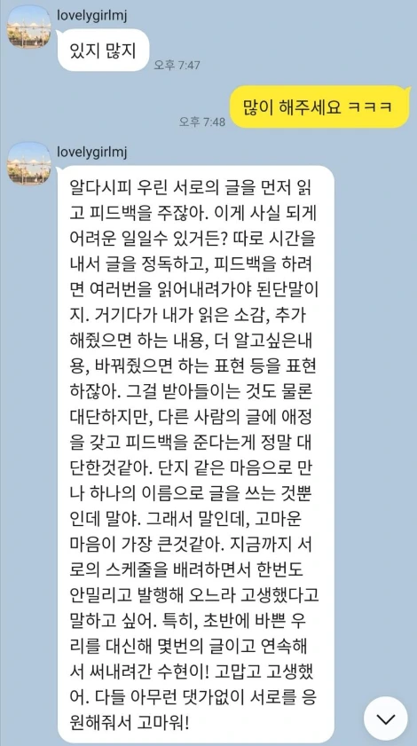 응응 맞아! 어떠한 이해관계가 아닌 순수한 만남이어서 좋았어! 그래서 우리가 좀 더 솔직히, 편안하게 서로에게 피드백하고 그걸 코멘트로 받아들일 수 있었던 거 아닐까?