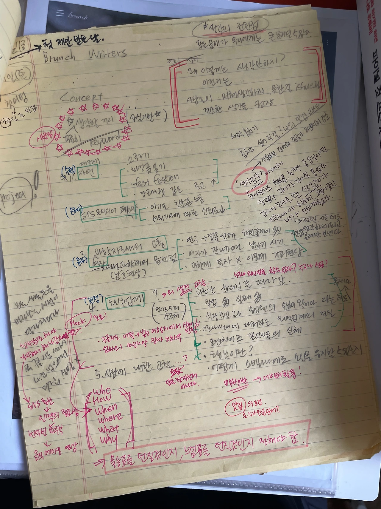 이 질문을 받으니 처음 수현이한테서 걸려온 전화가 생각이나. "다른 사람들은 왜 이렇게 생각 안 하지?"라는 질문으로 시작해 사람들이 미쳐 생각하지 못한 걸 수면 위로 떠올려 이슈화 시켜보고, 건강한 생각도 권장해보고 싶다 라는 취지였는데, 그 전화를 받으며 어느새 나도 모르게 메모지 한 장을 가득 채워 내용을 적고 있더라고. 당시 삶이 무료해지고 매일 같은 하루에 지쳐 가던 차에, 그 전화가 내 인생의 전환점이 되겠구나 싶었어. 심장이 뛰기 시작했어. 사람이 뭔가 꿈을 꾸며 살면 눈에 총기가 돋잖아? 그때 내가 잃었던 것들이었는데, 생기 잃은 당시 삶에 작은 빛이 들어오는 것 같았어.