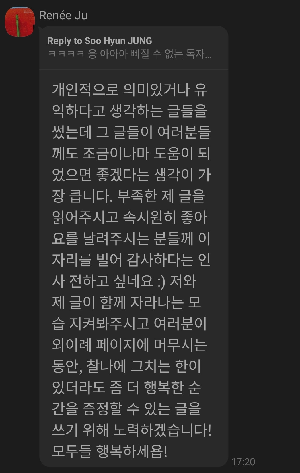 앞으로 내게 가장 중요한 숙제는 가장 나 다운 글을 쓰는 거라고 생각해. 그 때 만이 새롭고 좋은 글이 나올 수 있다고 생각하거든. 그러기 위해서는 다른 사람에게 동조하거나 유화되지 않고 나의 길을 자유롭게 갈 수 있는 사람이 되고자 해. 글을 쓰는 것에 있어서도 그렇고 삶에 있어서도 그렇고. 어떤 것에도 억압받지 않고 다 피지 못한 나를 피우는게 내 목표야!