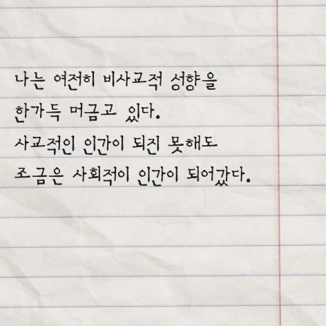 안타깝게도 이런 시도들이 나의 본질을 바꾸진 못했다. 나는 여전히 비사교적 성향을 한가득 머금고 있다. 아직도 처음 만난 사람은 어렵고, 전화보단 문자가 편하며, 대면보단 비대면을 선호한다. 하지만 엄마의 노력이 전부 물거품이 된 건 아니다. 사교적인 인간이 되진 못해도 조금은 사회적인 인간이 되었으니까.