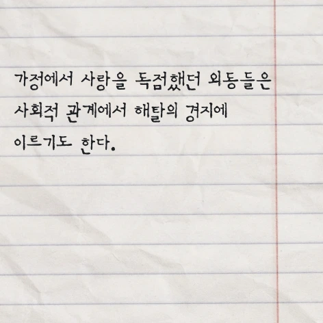 그렇다고 마음의 요동치지는 않는다. 이런 상황에서 불안해하는 사람은 오히려 애정결핍인 경우가 대부분이다. 가정에서 사랑을 독점했던 외동들은 사회적 관계에서 해탈의 경지에 이르기도 한다. ‘당신들이 아니어도 나를 가장 아껴주는 사람이 있으니 괜찮아’라는 마인드가 장착되어 있달까.