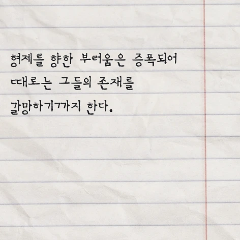 나의 말을 들어줄 형제가 생긴다면 다 쏟아내고 싶다. 울지 않기 위해 떨리는 목소리를 애써 감출 필요도 없다. 눈물을 흘리지 않기 위해 얼굴에 힘을 줄 이유도 없다. 그렇게 가슴속에 봉인했던 말을 시원하게 뱉어내고 싶다.