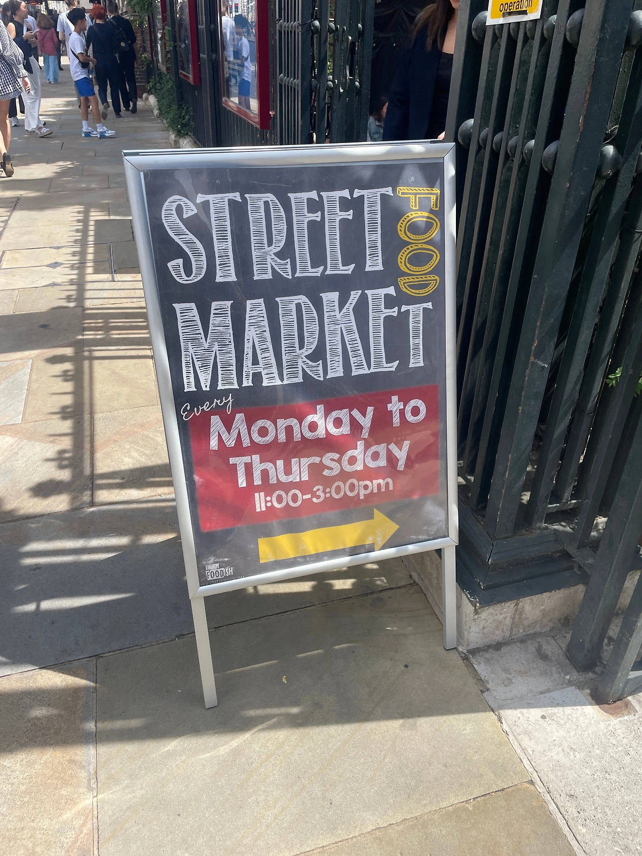 햄프스티드(Hampstead)로 향하던 중에 잠시 소호(soho) 거리를 지나게 되었다. 전 세계 어디든 소호지역은 사람이 넘쳐흐른다. 정신줄과 가방끈을 부여잡고 빠르게 걷는 그 순간, 나는 비밀스러운 입구 앞에서 멈춰 섰다. 스트리트 푸드 마켓? 여기 이런 게 다 있네. 월요일부터 목요일 점심시간에만 열리는 시장이라고? 언제 다시 소호에 올지 모르는데, 그럼 가야지! 나는 마치 이곳에 오려고 바삐 움직였던 사람처럼 주저 없이 안으로 들어섰다.