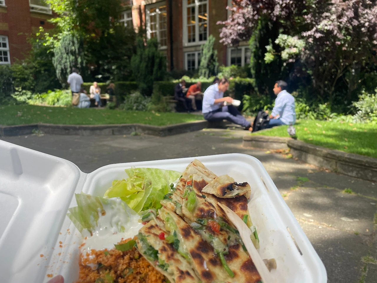 세인트 제임스 성당 앞에 있는 사우스우드 정원에서 열리는 작은 마켓. (나중에 알게 된 사실인데 이곳은 넷플릭스 시리즈 <브리저튼 2>의 촬영지였다.) 간이 천막에서 다양한 음식들이 기막힌 냄새를 풍기고 있었다. 비록 영국 음식은 아니고, 케밥이나 빠에야 같은 외국 먹거리들이 대부분이었지만. 오히려 좋아! 음식맛에 실망할 일은 없을 거라 생각했다.