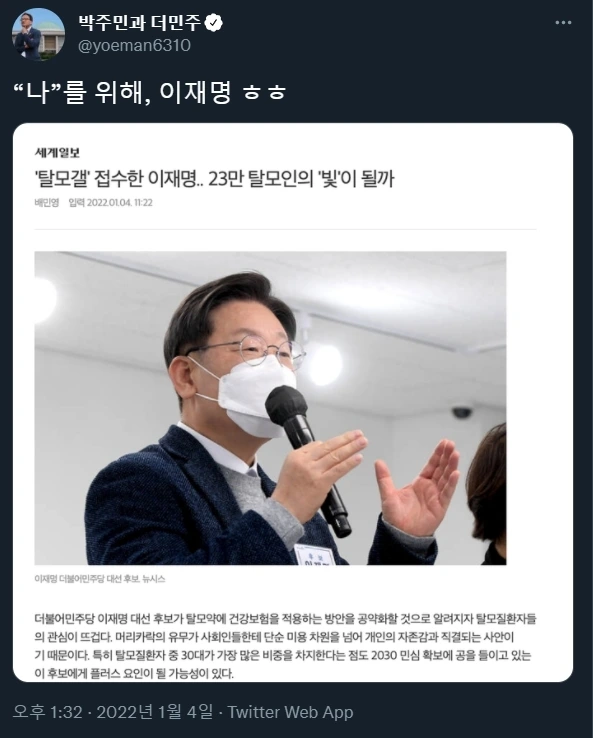 국민들이 대선을 통해 본인이 바라는 국가 복지/행정이 이뤄질 수 있다는 희망을 느끼는 거 좋은걸요. 그걸 이렇게 위트 있게 받아주는 우리 국민들도 좋구요. 그리고 솔직히…. 저도 탈모에서 자유로운 사람이 아니라서 조금 기대도 되고 그렇습니다ㅋㅋㅋㅋ 이런 대선과 관련된 위트 있는 이야기들이 앞으로도 많이 나오면 좋겠습니다. 오랜만에 ‘정치’ 관련 뉴스 보고 빵 터졌네요 ^^”