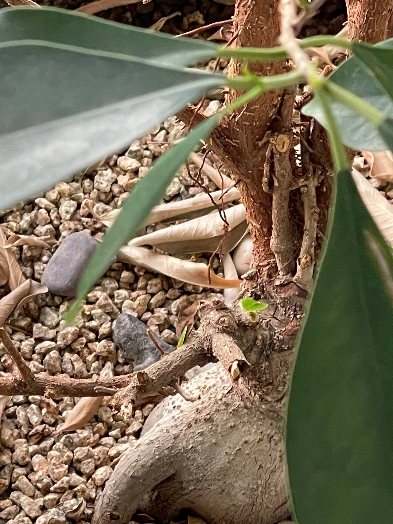 한 화분의 나무뿌리 쪽에서 새 잎이 돋는 걸 봤습니다