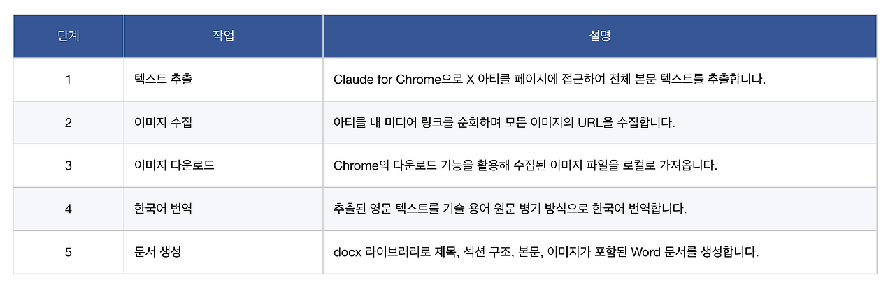 xtoword 스킬은 바로 이 Claude for Chrome을 통해 X 페이지에 접근하고, 텍스트를 추출하며, 이미지를 다운로드합니다. 작업 흐름은 크게 다섯 단계로 이루어집니다.