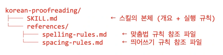 Skill Creator가 아래 구조를 자동으로 만들어주지만, 결과물의 구조를 이해해야 나중에 직접 수정하거나 문제를 진단할 수 있습니다. 이번에 설명할 맞춤법 스킬은 전체적인 교정 규칙을 정리한 SKILL.md 파일과 실제 띄어쓰기 규칙과 오탈자 규칙을 정리한 파일로 구성이 됩니다.