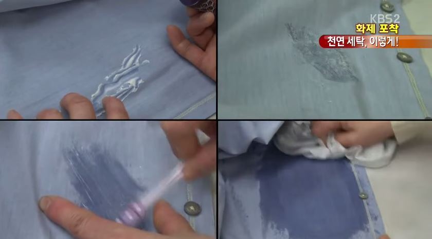 혈흔 자국에 과산화수소를 뿌린 후 거품이 잦아들면 가루세제를 위에 뿌려 비벼준다.