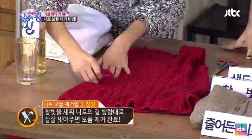 촘촘한 참빗을 수직으로 세워 니트의 결을 따라 살살 빗어주거나, 발뒤꿈치 각질을 제거하는 스톤으로 약하게 문지른다.