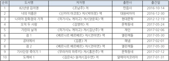 5년전 출간된 히가시노 게이고의 스테디셀러 '나미야 잡화점의 기적'은 3위를 차지해 저력을 과시했고 김영하, 베르나르 베르베르, 김훈, 무라카미 하루키, 김은숙 등이 뒤를 따랐다.