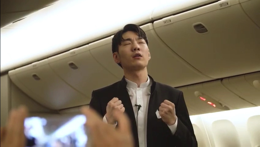 영상은 JTBC ‘팬텀싱어2’에서 준우승하며 주목 받은 ‘미라클라스’ 한태인이 탑승객들을 향해 깜짝 안내 멘트를 하며 시작된다. 그는 “베네치아로의 첫 비행을 축하하기 위해” 국내 최고 음향 전문 브랜드와 함께 세계 최초로 칸초네 공연을 펼치겠다고 말하고, ‘섹시농부’가 별명인 같은 팀 정필립과 함께 탑승객들 앞에 등장한다.