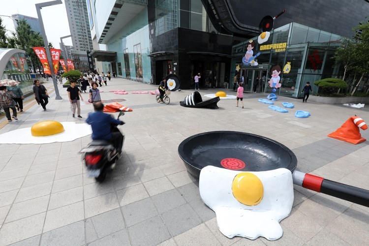 해당 백화점 앞에는 달걀 프라이, 녹아버린 러버콘, 바닥에 녹아 붙은 슬리퍼 등의 조형물이 설치됐다. 대구와 아프리카를 결합한 '대프리카'를 상징하는 조형물로 대구 출신 작가와 지역 디자인 업체가 제작했다.