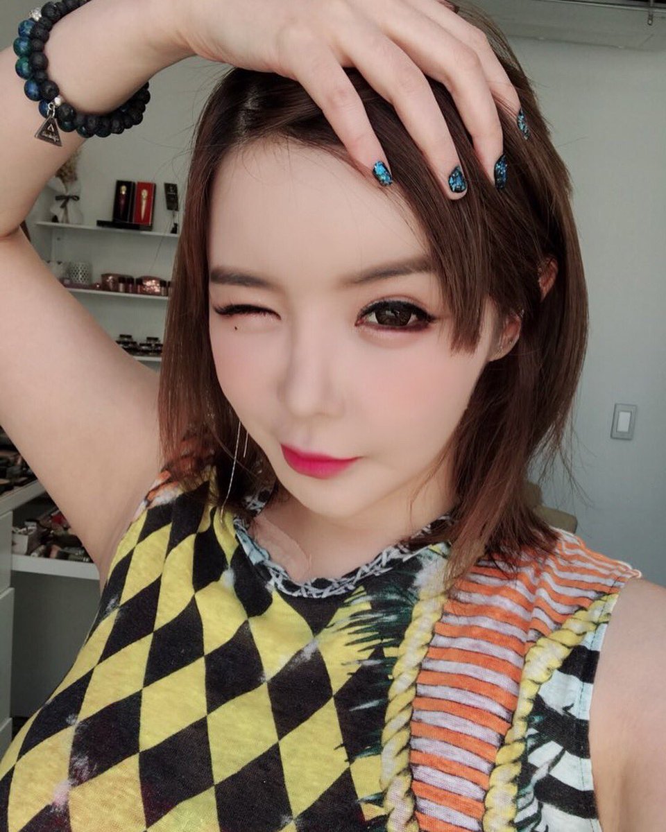 사진 속 박봄 씨는 짧은 머리 위에 손을 올리고 깜찍한 표정을 짓고 있다.