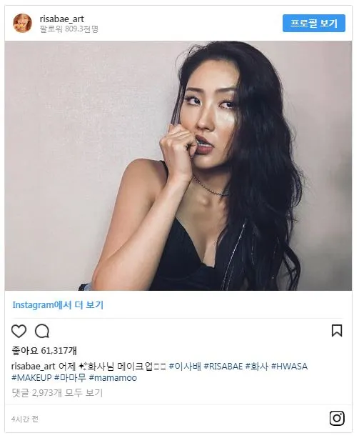 6일 이사배는 인스타그램에 "어제 화사님 메이크업"이라는 글과 함께 사진을 게재했다. 사진에는 화사 메이크업을 완벽히 재현한 이사배 모습이 담겨있다.