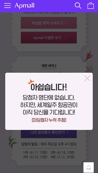 1200만원 상당의 대한항공 세계일주 항공권을 증정하는 바로 이 '역대급' 이벤트의 1차 당첨자가 공개됐다. 1차 당첨자는 10명으로 아모레퍼시픽몰 내 사이트에서 지난 11일 공개됐다.