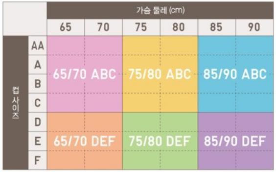 컵 사이즈가 A나 B나 C에 속한다면 가슴둘레에 따라 ‘65/70 ABC’, ‘75/80 ABC’, ‘85/90 ABC’ 세 가지 사이즈 중 고를 수 있는 방식이다. A컵과 C컵이 어떻게 같은 사이즈를 입을 수 있을까? 의문이 들 수 있지만 실제로 착용해보니 입체 구조의 브라 컵이 각 가슴 모양과 크기에 따라 조정돼 컵 안쪽이 비어 보인다거나 뜨지 않아 걱정하지 않아도 된다. 매장에 방문하여 직접 샘플용 제품을 착용해보는 것도 좋다.