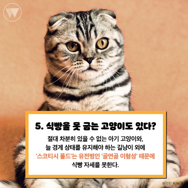 '스코티시 폴드'는 유전병인 '골연골 이형성' 때문에 식빵 자세를 못한다.