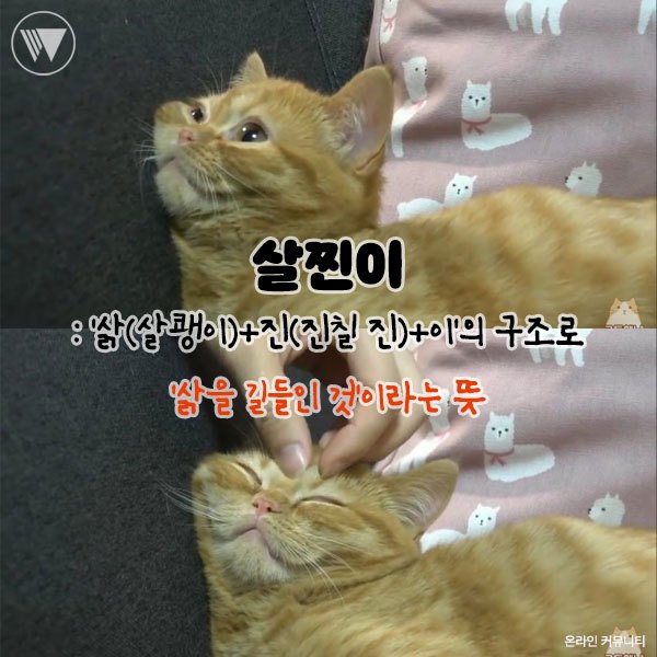 '살찐이'는 '삵+진+이'의 구조로 이루어진 단어로 '삵(살쾡이)를 길들인 것'이라는 의미가 담겨있다.