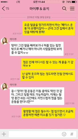 책 속에 실린 일본 패션 잡지 모델들의 대화를 카톡 대화로 재구성해봤다. 실제 ‘껌 다이어트 운동법’에 효과를 본 모델들의 대화를 살짝 엿보자.