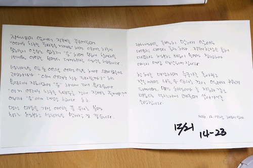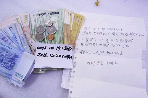 이 편지에는 "박스, 헌 옷, 캔 여러 가지 모아서 팔았더니 돈이 이것뿐이네요"라며 "더 힘든 사람에게 보탬이 될까 하고 왔다 가오. 추운데 고생하시네요"라는 메모가 남겨있었다.