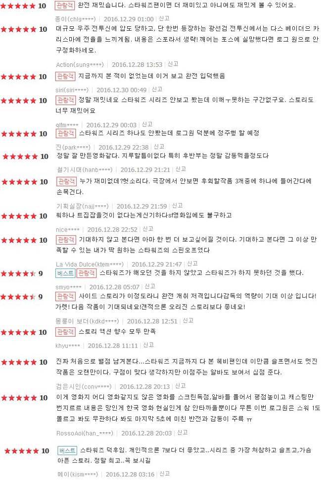 개봉 이후 관람객들의 입소문을 타고 있는 ‘로그 원’은 포털사이트 네이버 영화 평점에서 2일 기준 각각 관람객 평점 8.35, 네티즌 평점 8.64로 높은 점수를 받았다.