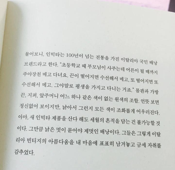 이 책의 구절에 나오듯이 가방하나를 끈 떨어지면 수선해서 메고 평생 가지고 다닌다는 것을 사실 상상하기가 힘들다. 가방이 아니더라도 어떤 물건이라도 낡고 바래면 새로운 것으로 금새 바꿔버리니까.
