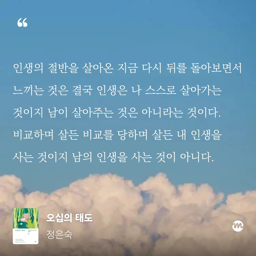 인생의 절반을 살아온 지금 다시 뒤를 돌아보면서 느끼는 것은 결국 인생은 나 스스로 살아가는 것이지 남이 살아주는 것은 아니라는 것이다. 비교하며 살든 비교를 당하며 살든 내 인생을 사는 것이지 남의 인생을 사는 것이 아니다.