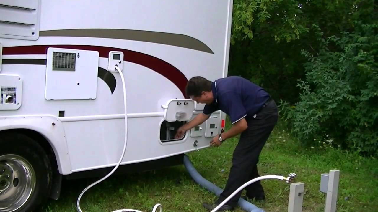 - 캠핑장 Hook Up 에 연결해서 공급받는다. 물론 캠핑카에 White Water Tank 가 설치되어 있어야 하고, 그에 따른 코넥터와 호스도 준비가 되어 있어야 한다.