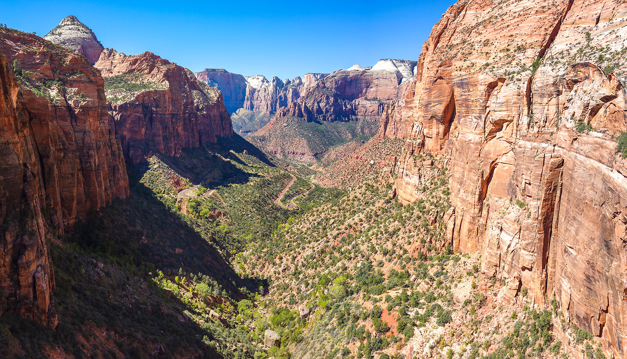 자연이 나를 부른다! 몸도 찌뿌둥 하니, 바로 등산을 가보자. 먼저 자이언 캐년를 대표하는 트랙킹 코스인 'Angels Landing' 으로 향한다. 하늘은 푸르고 산은 아름답다. 이곳은 정녕 천국이 맞다 싶다. 정면에 보이는 저 봉우리 꼭데기가 바로 'Angels Landing', 천사들이 내려와 노는 곳이다. 별로 안 높아 보인다고? 저래뵈도 500미터를 거의 수직으로 산을 타야하는 쉽지 않는 코스다.
