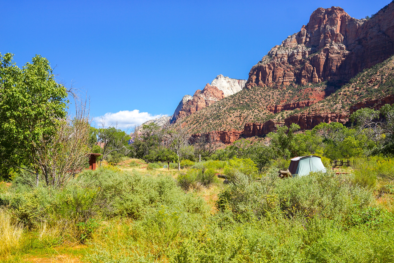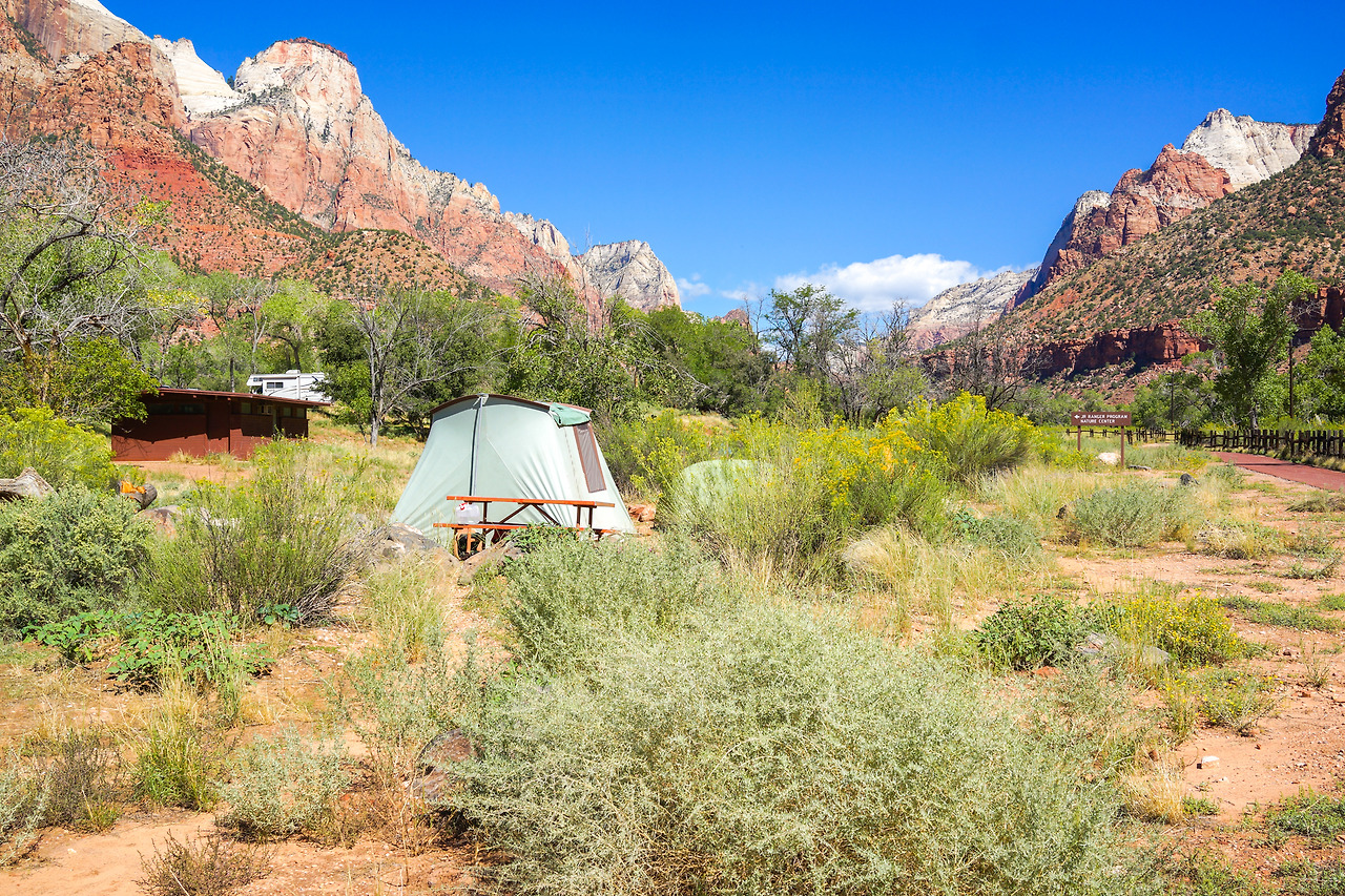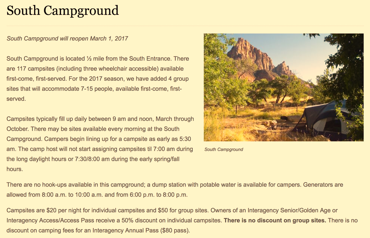우리가 캠핑한 'South Campground' 는 자이언 캐년 캠핑장 중 가장 안쪽에 위치한다. 따라서, 화장실/물/쓰레기장 말고는 아무런 시설이 없으며, 보통 이런 캠핑장들은 예약을 미리 받지 않고, 그날 그날 선착순으로 입장을 시킨다. (솔직히, 맘 내키면 출발하는 우리같은 사람들에겐 이게 더 좋다. 별로 몇 달 전부터 스케줄 확정하는 스타일이 아니다.)