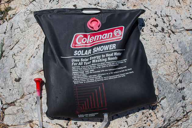 나무에 매달아 놓으면 중력에 의해서, 전기나 가스 없이도 따뜻한 샤워를 할 수 있다. 100% 무공해, 무 에너지 샤워 시스템이 되겠다. (10불도 안한다. 대박!) 캠핑장에 따라서, 나무에 이런 Solar Shower 를 매달지 못하게 금지하고 있는 곳도 있다. 따라서, 반드시 캠핑장에 문의를 하고 설치해야 한다.