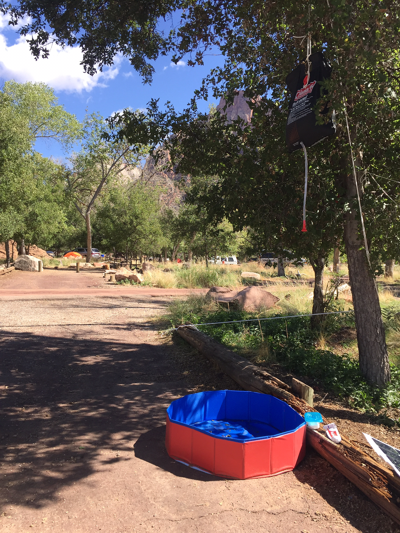 먼저, Solar Shower 라고 부르는 간이 샤워기를 구매했다. 팩에 물을 채워넣고 낮에 햇빛이 잘드는 곳에 두면, 하루종일 물이 데워지고, 그 열기가 빠져나가지 않게 유지를 한다. 이번에 처음 써 봤는데 생각보다 아주 쓸만하다. 해가 떨어진 뒤에 샤워를 했는데, 그때까지도 상당히 따뜻했다. (참고로 이 지역은 사막지역이라, 해가 떨어지면 바로 시원 내지는 쌀쌀해진다.)